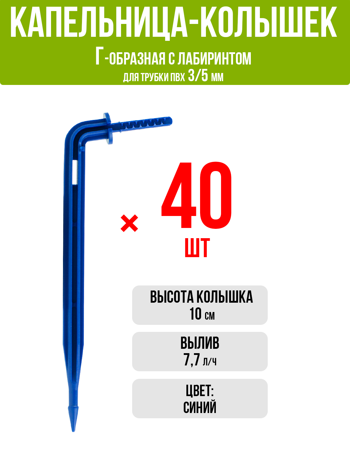 Капельница Г-образная с лабиринтом, 10см, 7,7л/ч, синяя (подключается к трубке ПВХ 3/5мм) - 40 штук 475 ₽