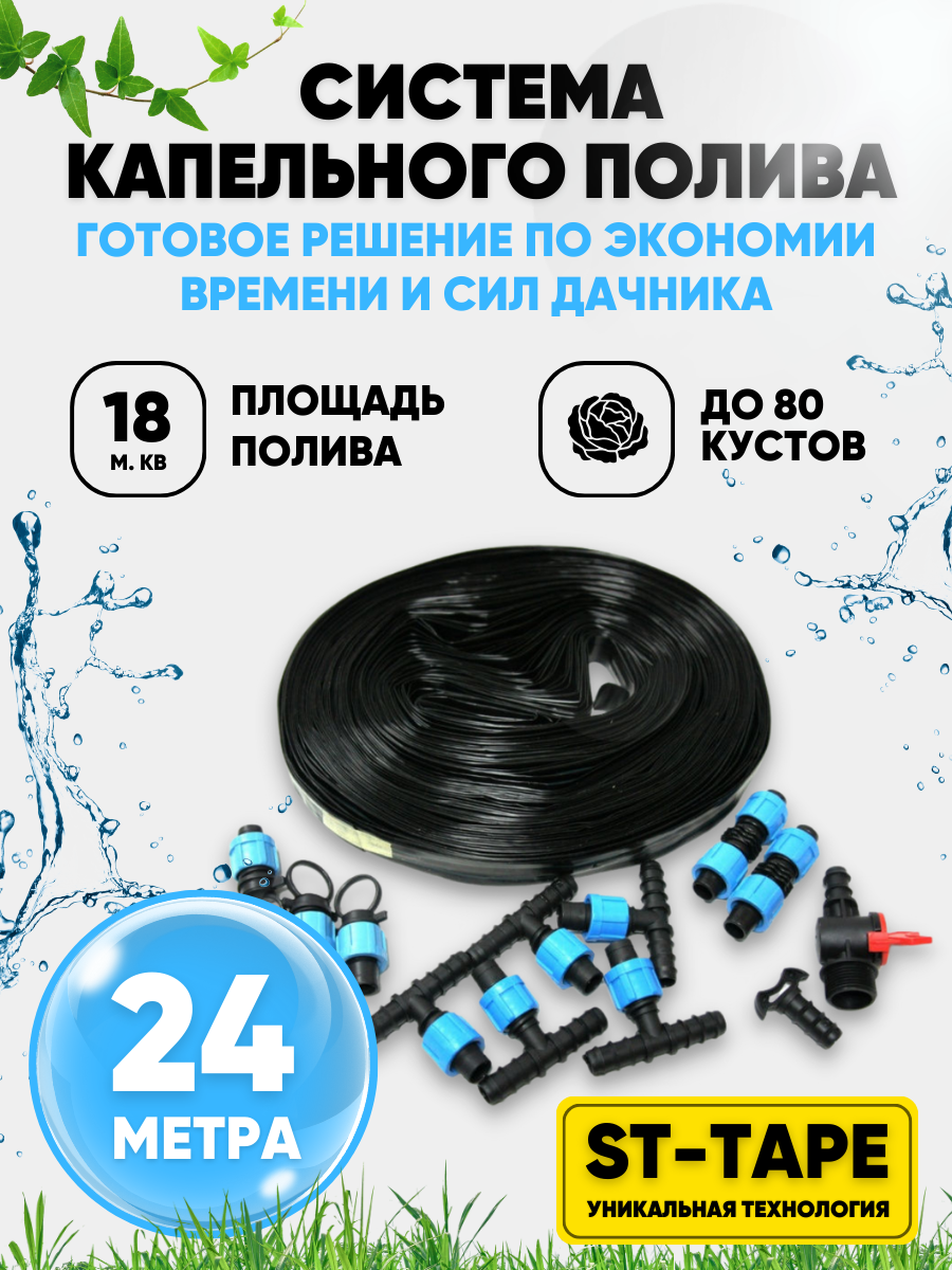 Набор капельного полива ЭКО-24, длина капельной ленты: 24 м, кол-во растений: 80 шт, площадь: 18 кв.м. информация: