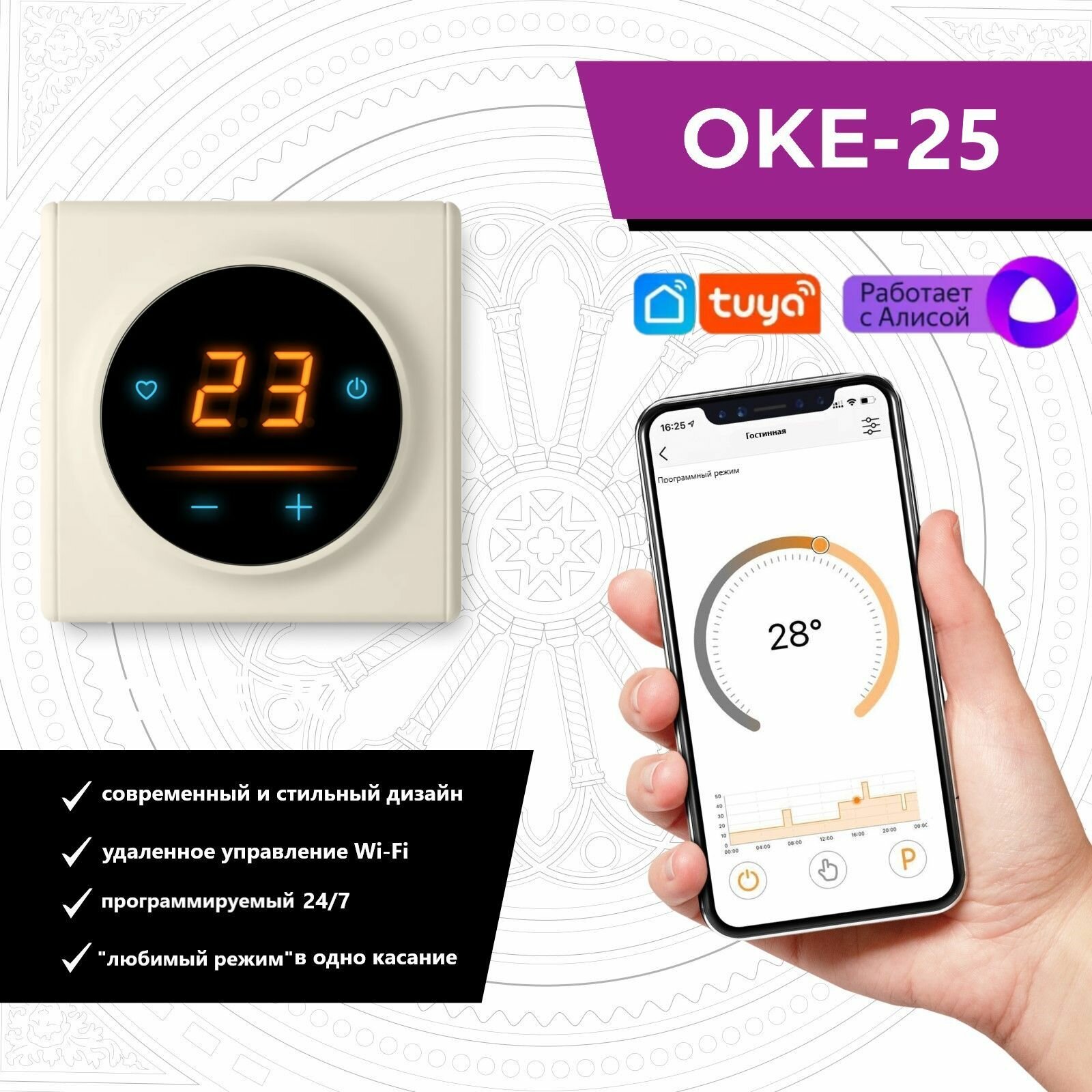 Терморегулятор/термостат для теплого пола OneKeyElectro c WiFi ОКЕ-25 в бежевой рамке информация: