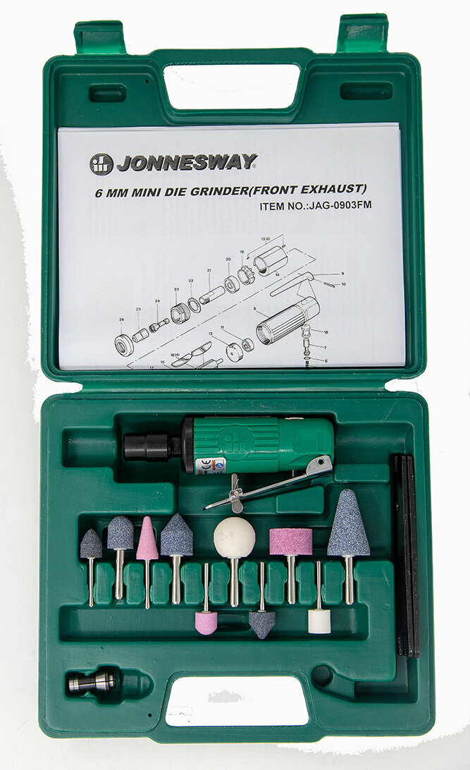 | Дополнительная информация | Набор бормашинка пневматическая 25000 об/мин., патрон 3/6 мм, L-152 мм с насадками, 15 предметов Jonnesway |