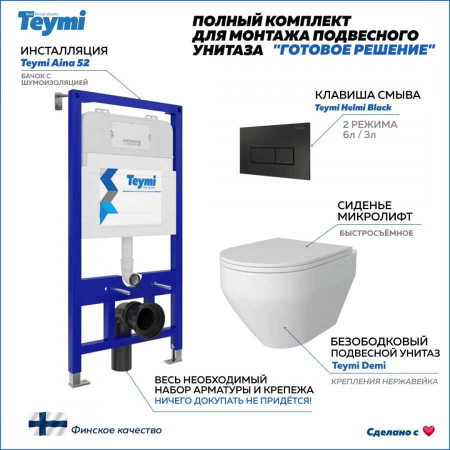 Комплект Teymi "Готовое решение": Инсталляция Aina 52 + клавиша смыва Helmi черная + унитаз Demi F00340 информация:
