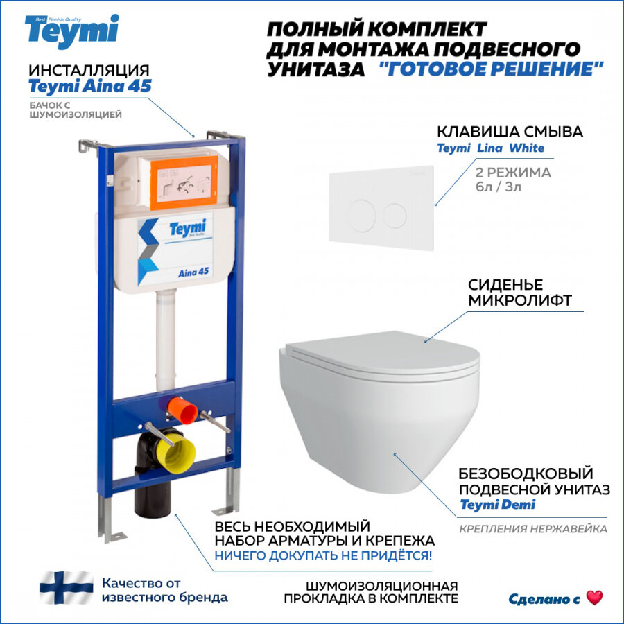 Готовое решение Teymi: Инсталляция Aina 45 + клавиша смыва Lina белая + унитаз Demi F01384 информация: