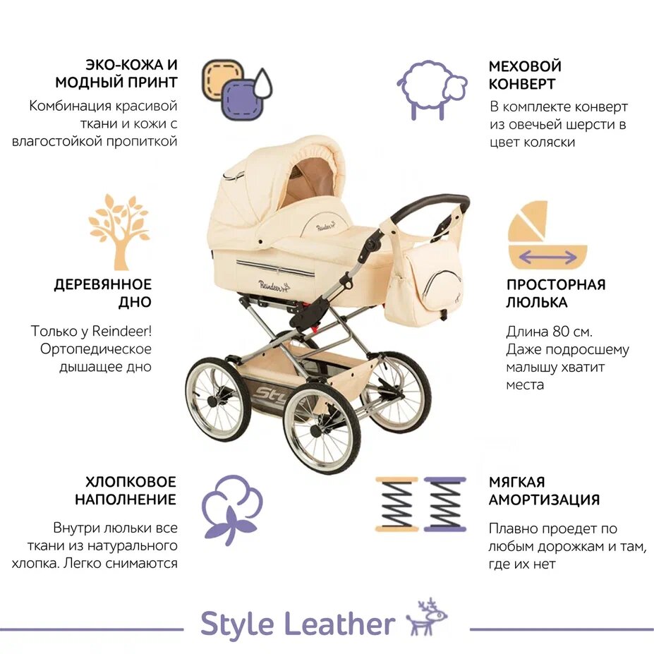 Отзывы на Коляска Reindeer Style Leather Collection цвет бежевый SLC2, 2в1 люлька+прогулочный блок, с конвертом, всесезон