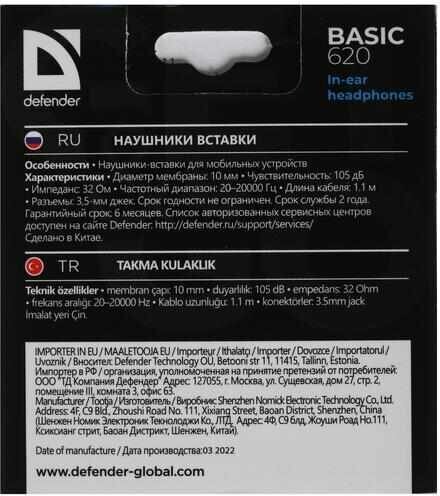 Наушники вставки DEFENDER Basic 620 черный [10mm, 20Гц~20kГц, 32 Ом, 1.1 м]