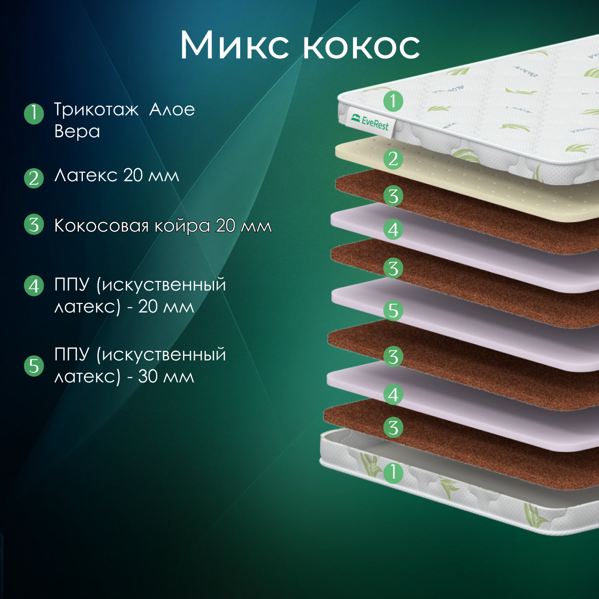 Матрас Everest Микс Кокос - беспружинный, чредование слоев латекса и кокоса, высокая жесткость, нагрузка до 130 кг, высота 17 см 155х200 37 638 ₽