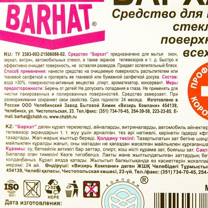 Бархат Средство для мытья стекол и зеркал Barhat Iskra, цитрусовый микс, с изопропиловым спиртом, без распылителя, 500 мл./В упаковке шт: 1