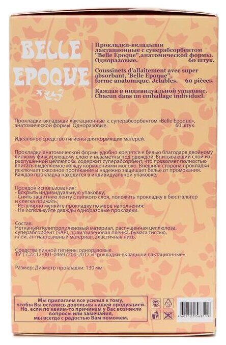 Прокладки-вкладыши лактационные с суперабсорбентом , анатомической формы "Belle Epoque" - 60 шт. информация: