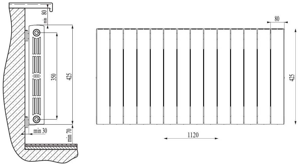Радиатор секционный Rifar SUPReMO 350, кол-во секций: 14, 19.6 м2, 1960 Вт, 1120 мм.