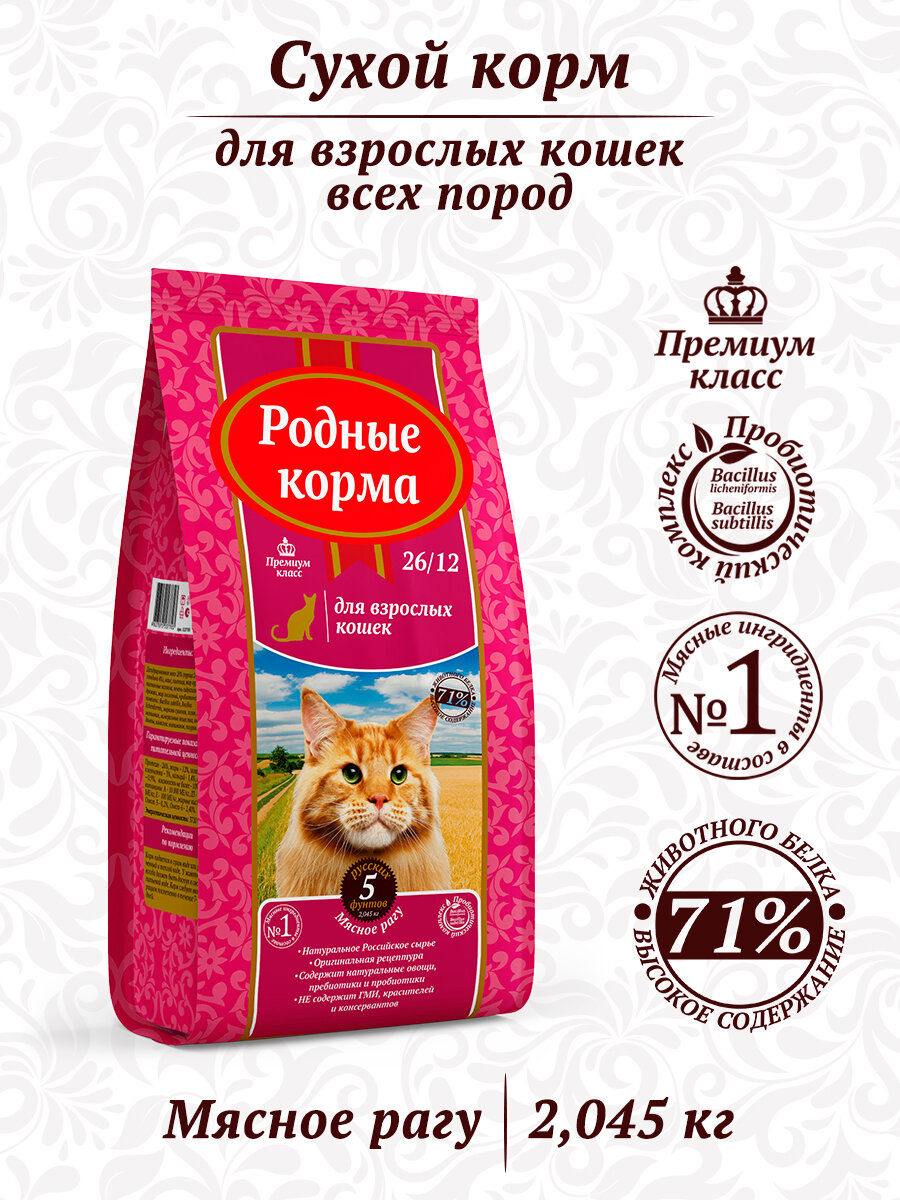 Корм сухой родные корма 26/12 5 русских фунтов для взрослых кошек, мясное рагу 2,045 кг 2 423 ₽