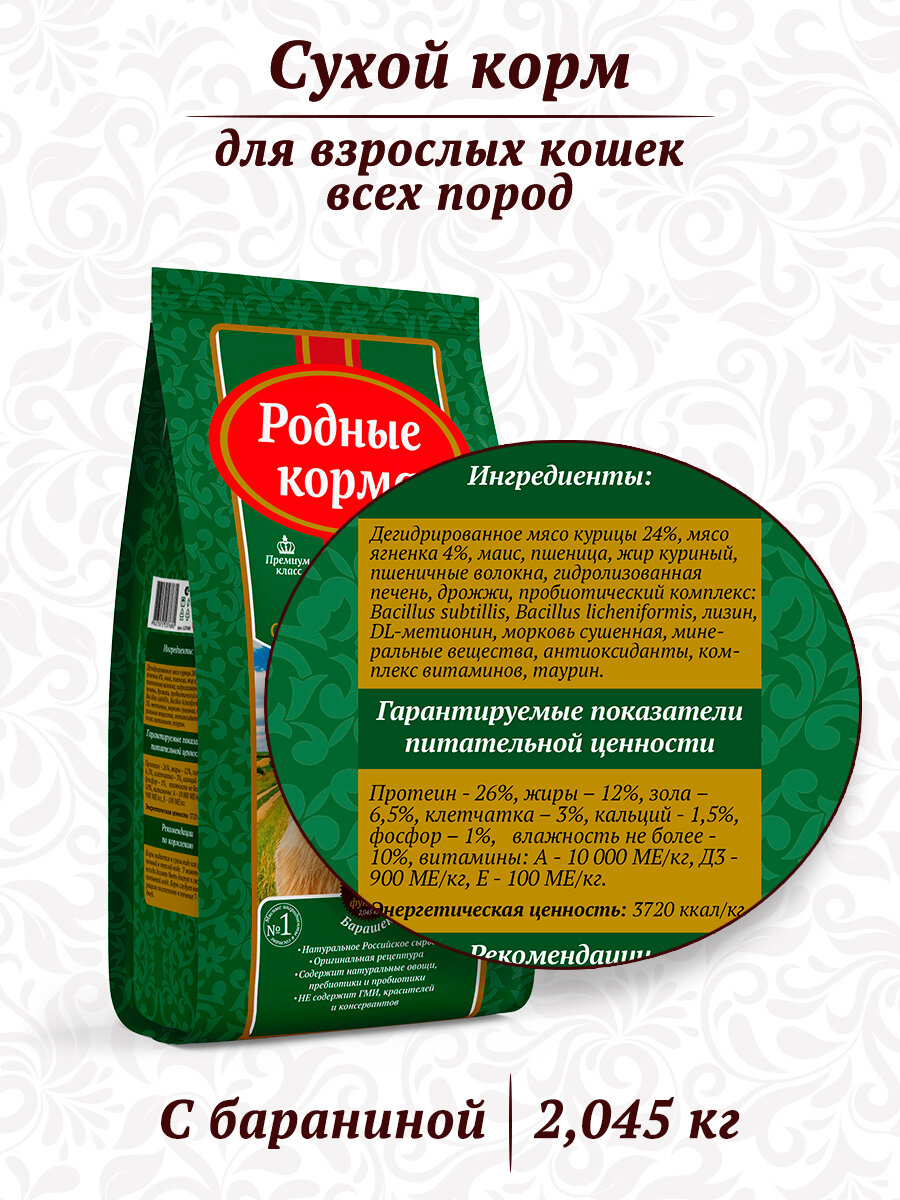 Родные корма для взрослых кошек с бараниной 26/12 (2,045 кг) информация: