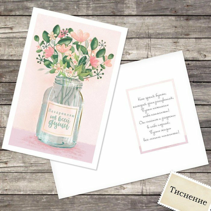 Отзывы на Открытка с тиснением «Поздравляю от всей души», цветы в банке, 12 х 18 см (комплект из 60 шт)