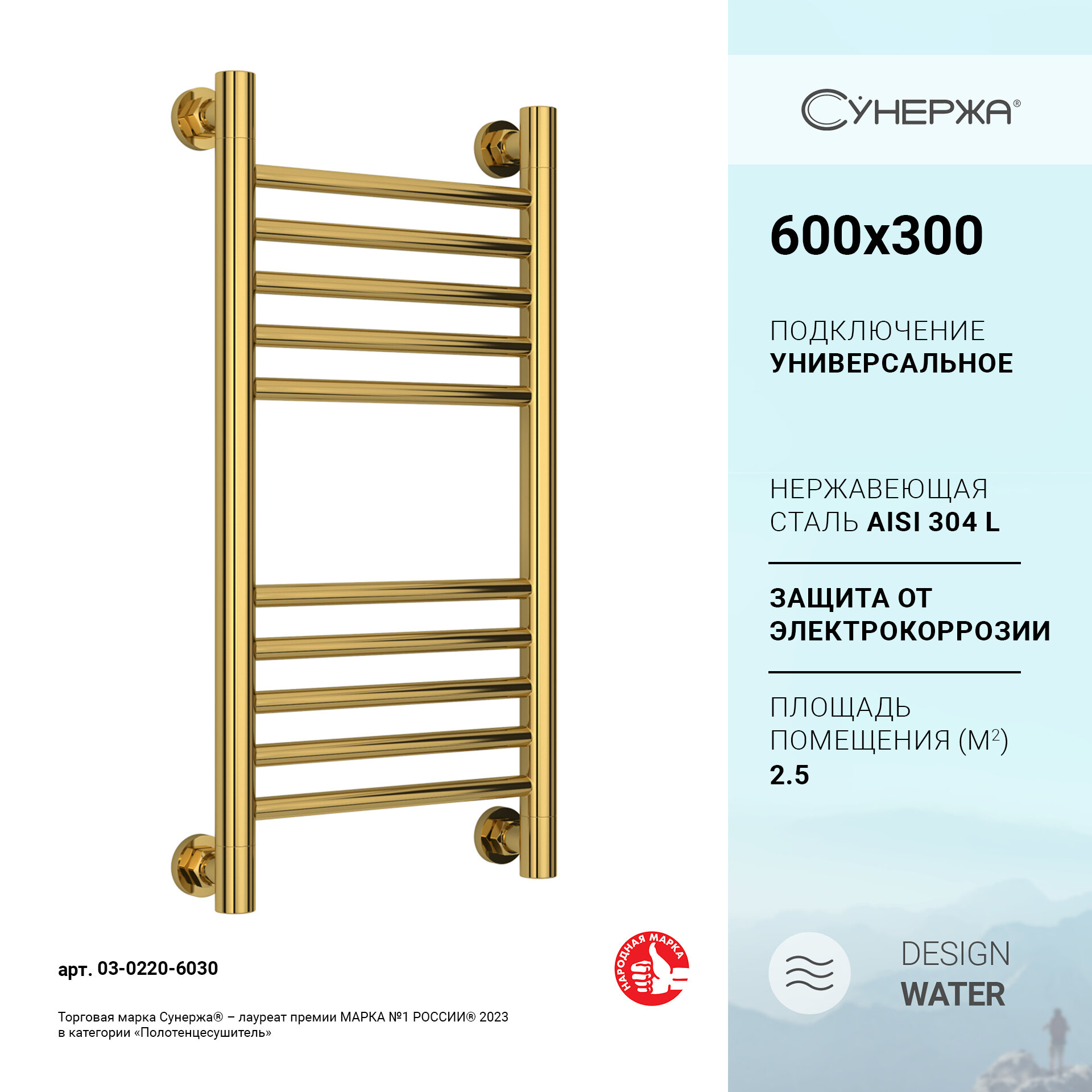 Водяной полотенцесушитель Сунержа Богема+ (прямая) 600x300 золото арт. 03-0220-6030