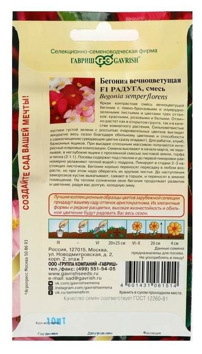 Семена цветов Бегония "Радуга", F1, вечноцветущая, смесь, гранулы, 7 шт информация: