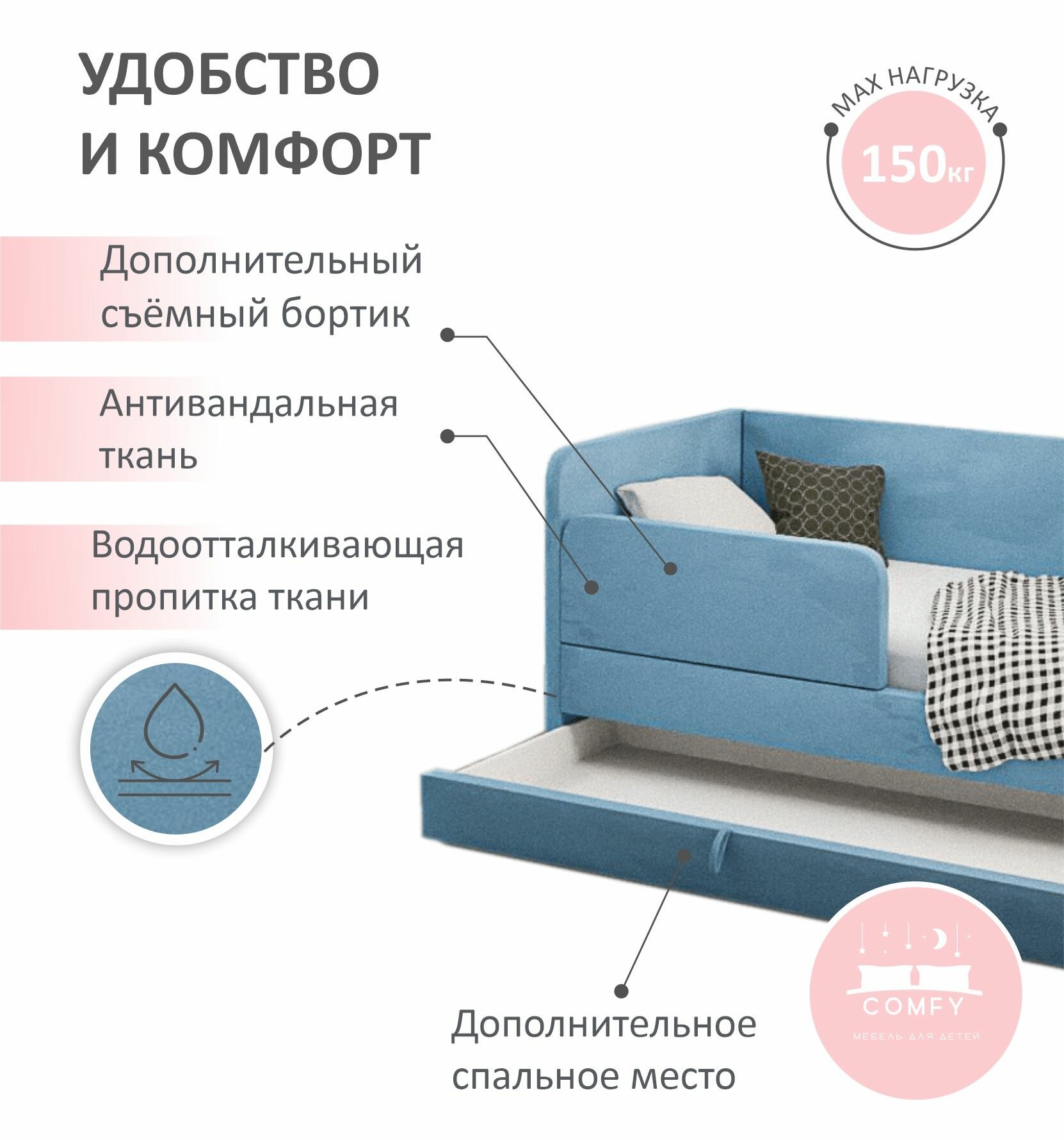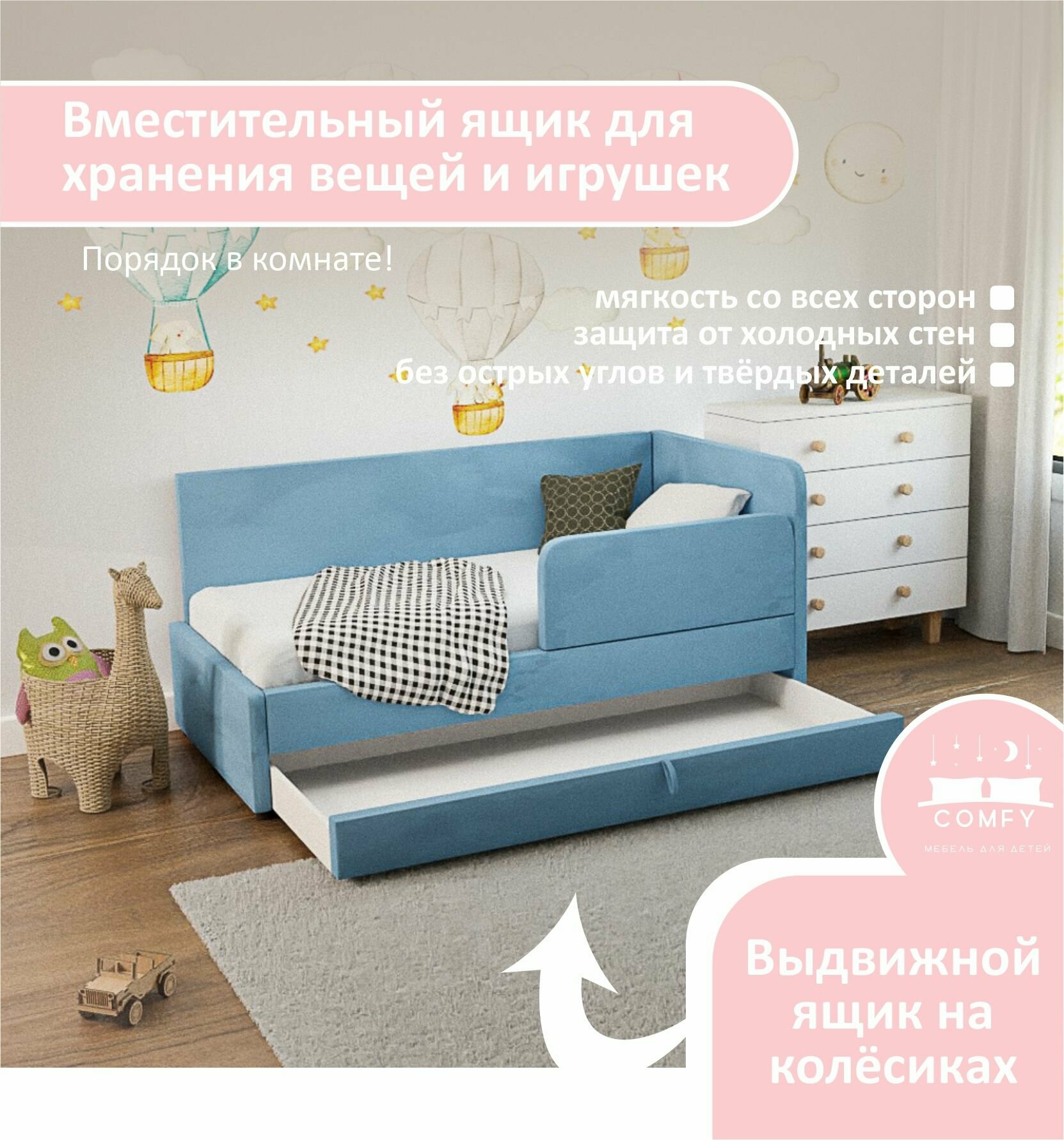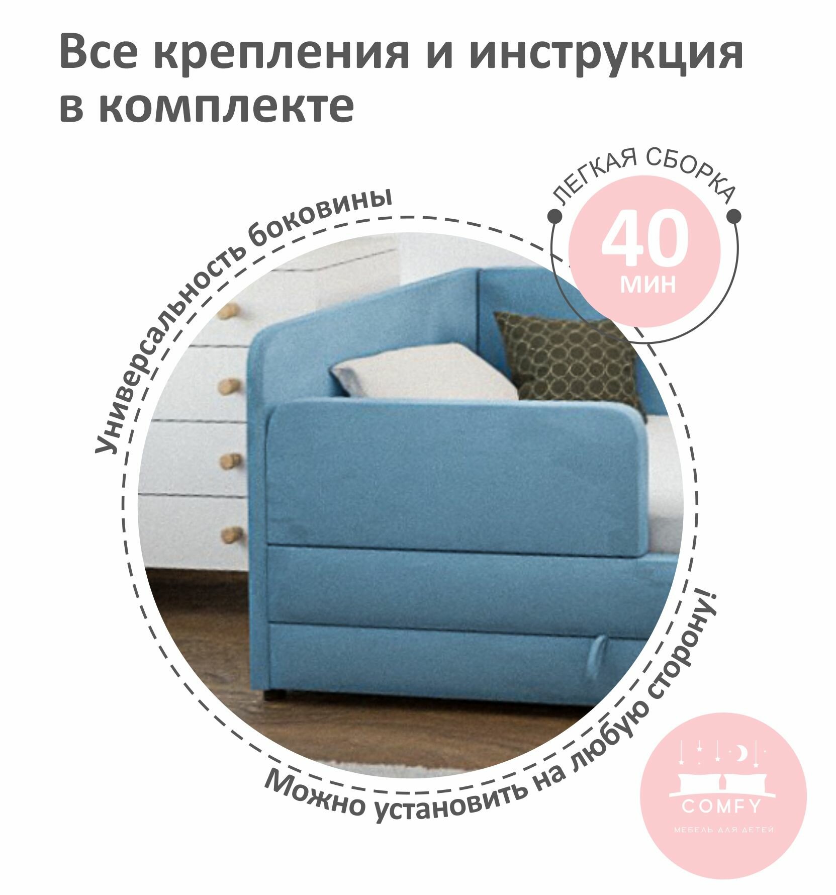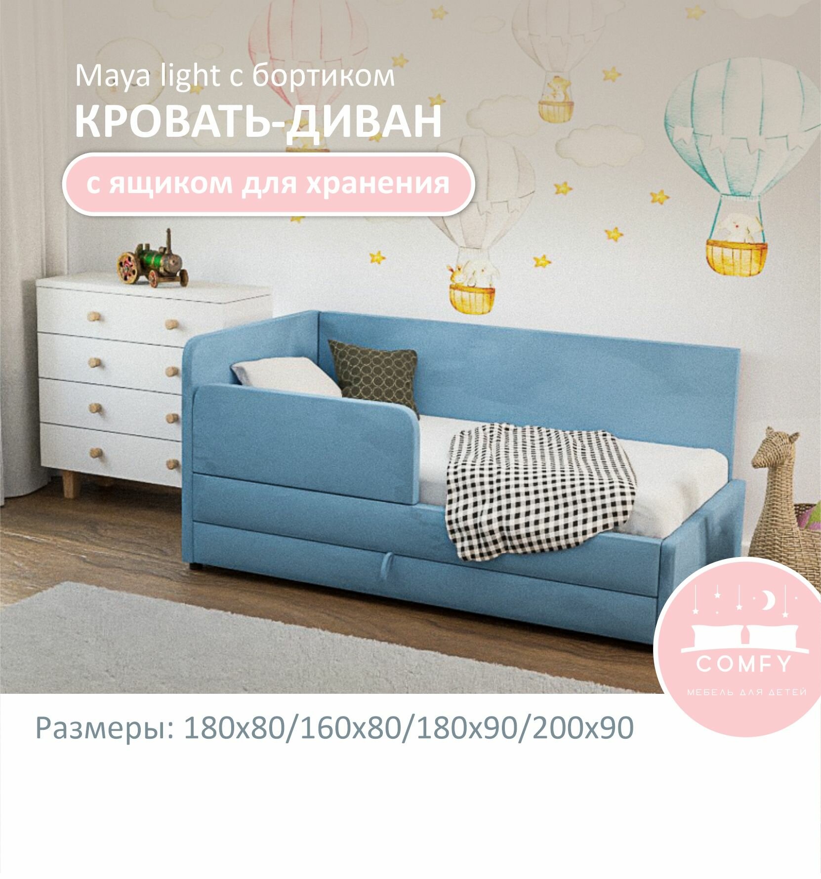 Детский диван-кровать Майя Лайт 200х90 см голубой с выкатным ящиком и бортиком Кровать детская от 3х лет Без матраса информация: