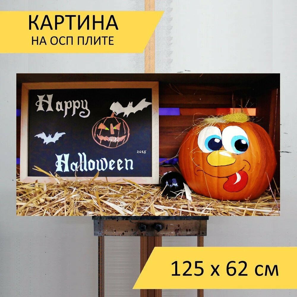 Картина на ОСП 125х62 см. "Счастливого хэллоуина, приветствие, тыква" горизонтальная, для интерьера, с креплениями информация: