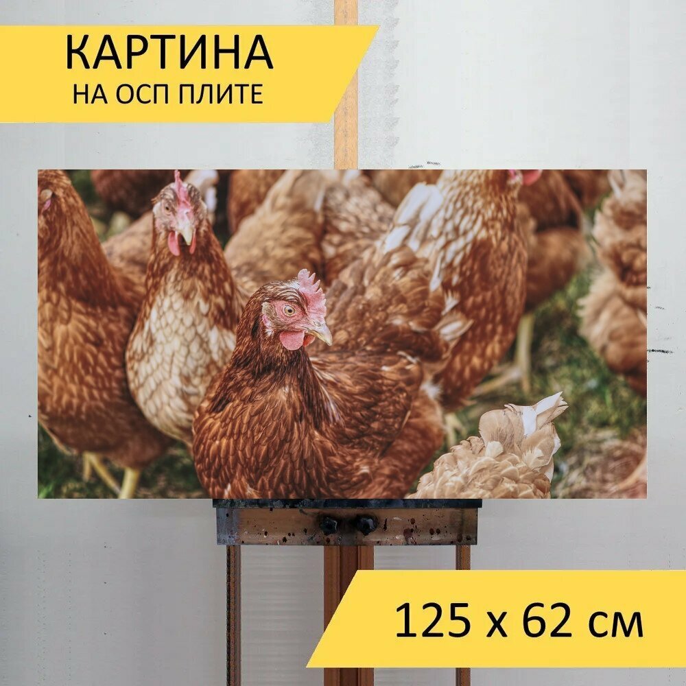 Картина на ОСП 125х62 см. "Курица, домашняя птица, свободный ход" горизонтальная, для интерьера, с креплениями информация: