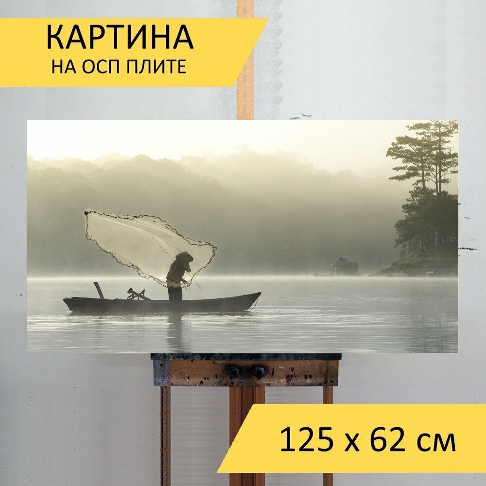 10 цен на Картина на ОСП 125х62 см. "Рыбак, ловит рыбу, озеро" горизонтальная, для интерьера, с креплениями