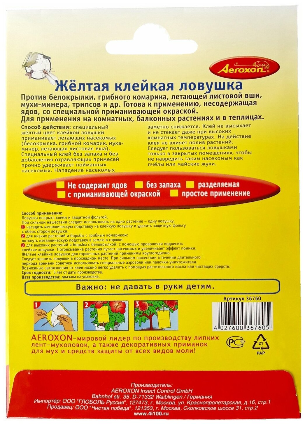 AEROXON ( Аэроксон ) Желтые липкие полосы от вредных насекомых (тля, белокрылка и др.), 9х13см, 5 штук (Германия) информация: