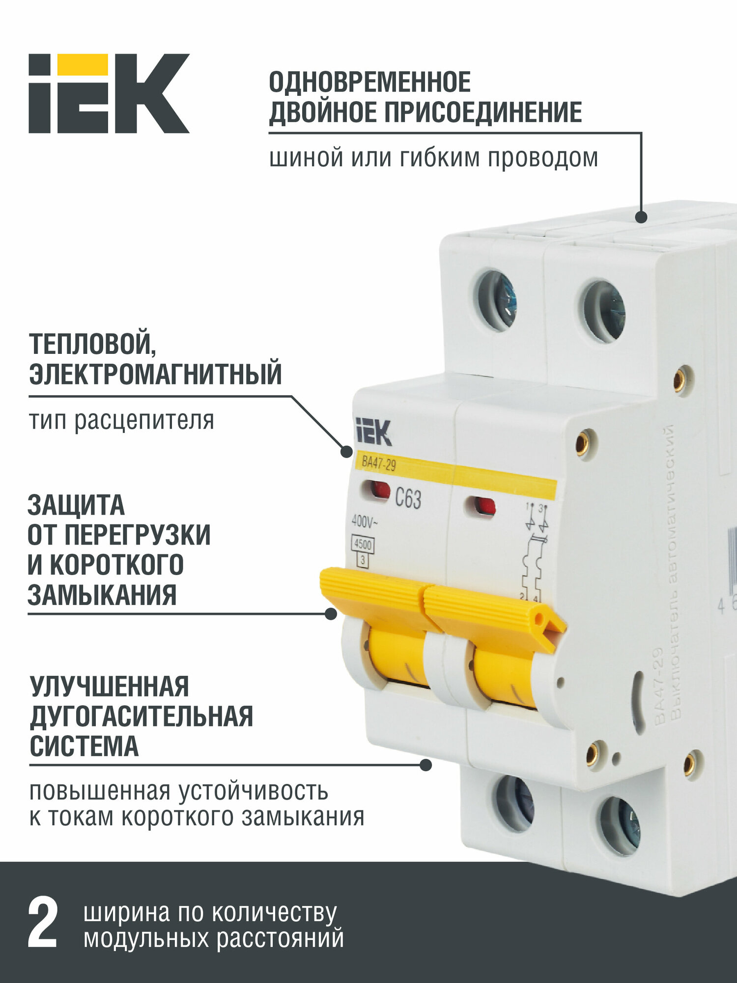 Выключатель IEK автоматический 63A тип C 4.5kA 2П 400В 2мод белый (упак.:1шт) информация: