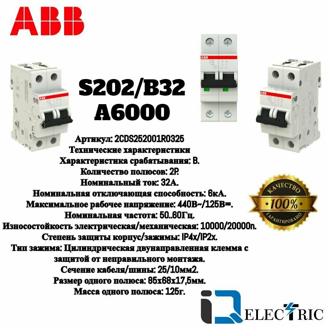 Автоматический выключатель ABB S202 2P 32A тип B 6kA 2CDS252001R0325 информация: