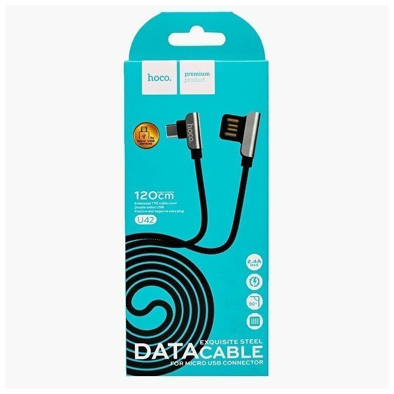 Кабель USB2.0 Am-microB Hoco U42 2.4A Black, оба коннектора угловые, сталь, черный - 1,2 метра 221 ₽