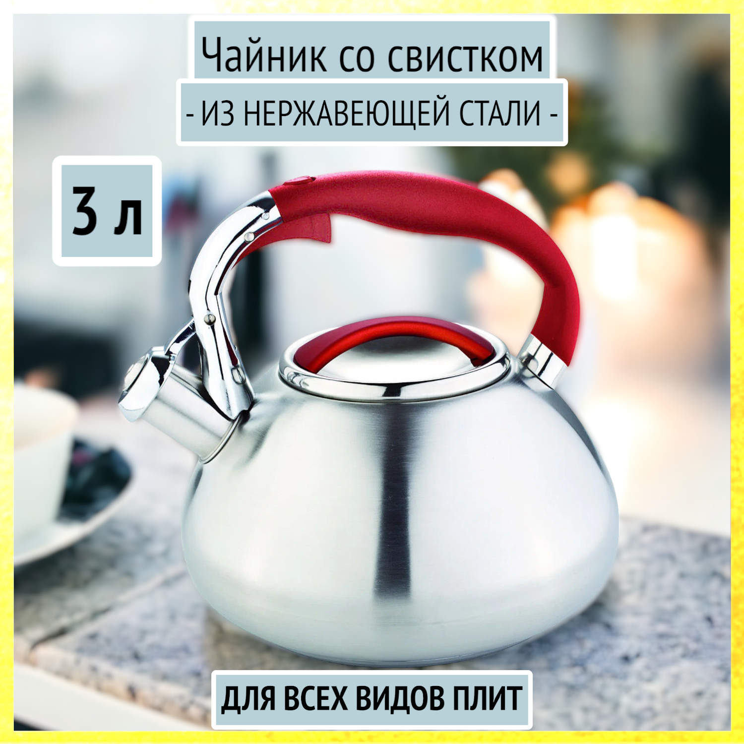10 цен на Чайник 3 л из нержавеющей стали со свистком, Rainstahl, RS-7602-30WK, красная ручка