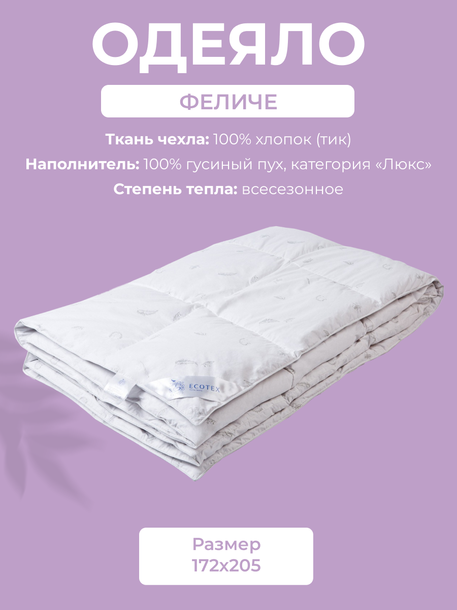 Отзывы на Одеяло пуховое кассетное Ecotex 2 спальное с наполнителем натуральный гусиный пух 100% Феличе 172x205