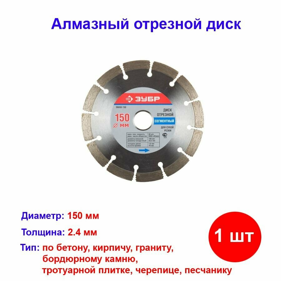 ЗУБР универсал 150 мм, диск алмазный отрезной по бетону, кирпичу, граниту, тротуарной плитке (150х22.2 мм, 10х2.4 мм), 36650-150, серия Профессионал