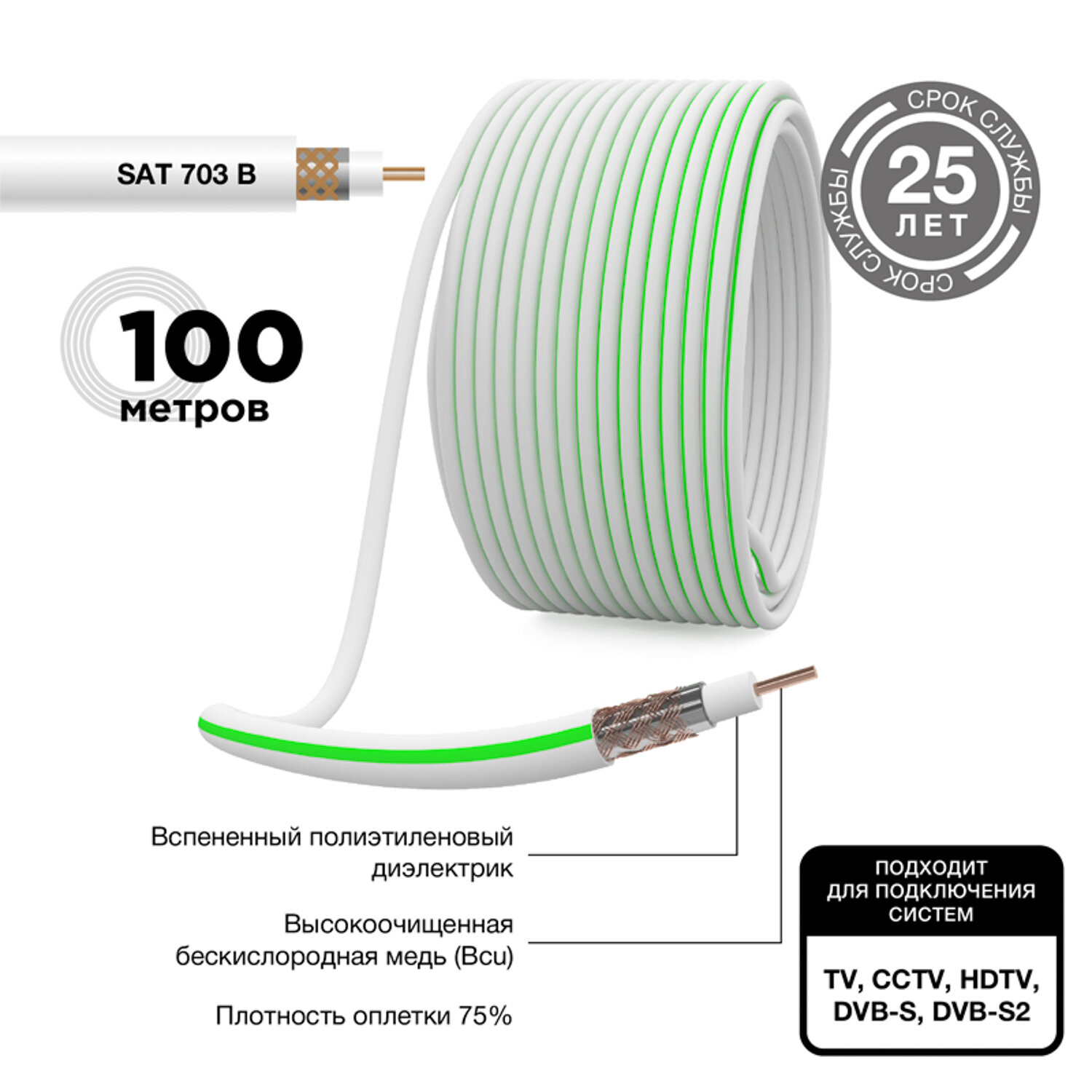 Кабель коаксиальный SAT 703 B, Cu/Al/Cu, 75%, 75Ом, 100м, INDOOR, белый REXANT 01-2431 4 155 ₽