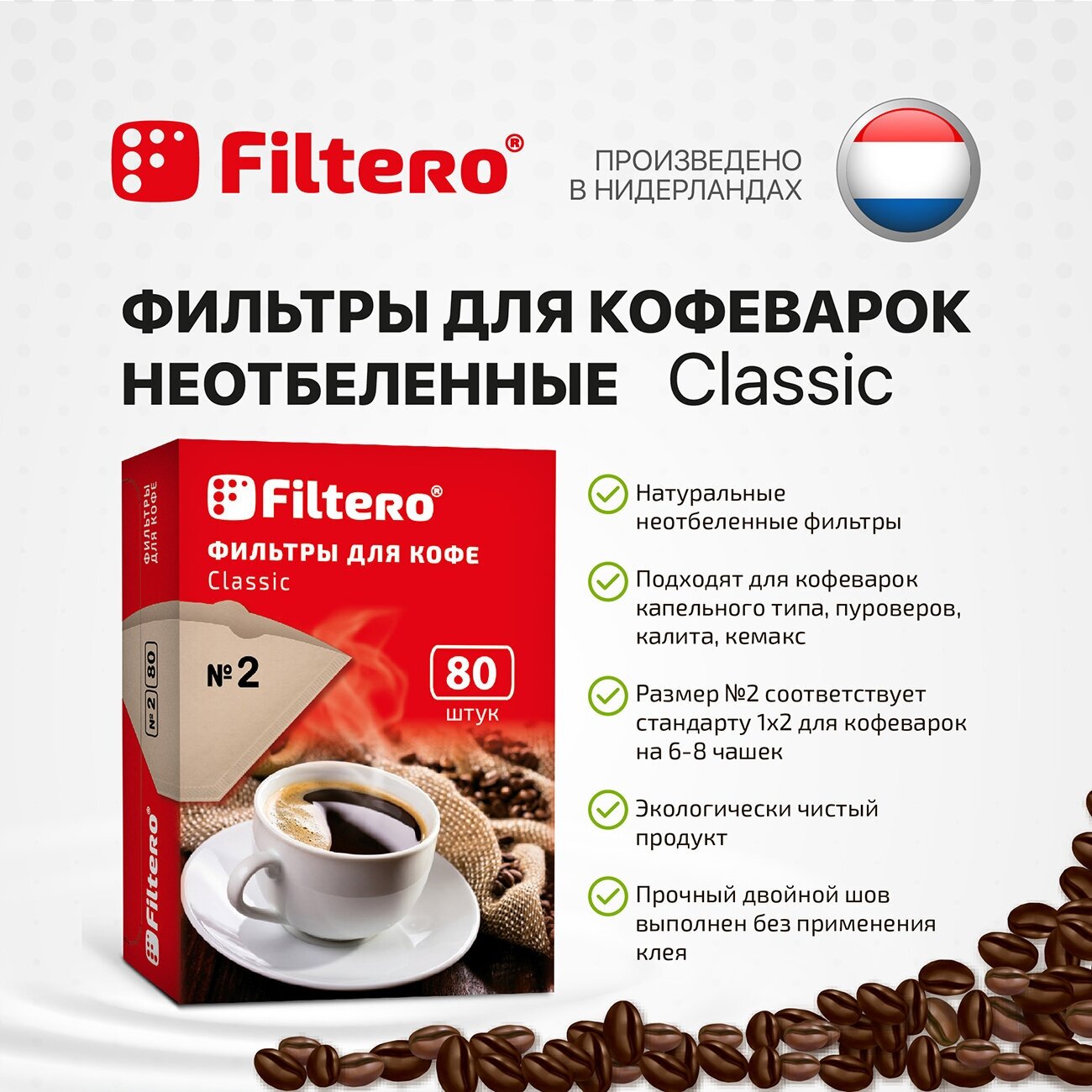 Комплект фильтров для кофе, кофеварки и кофемашин Filtero Classic №2, 80штук, неотбеленные информация:
