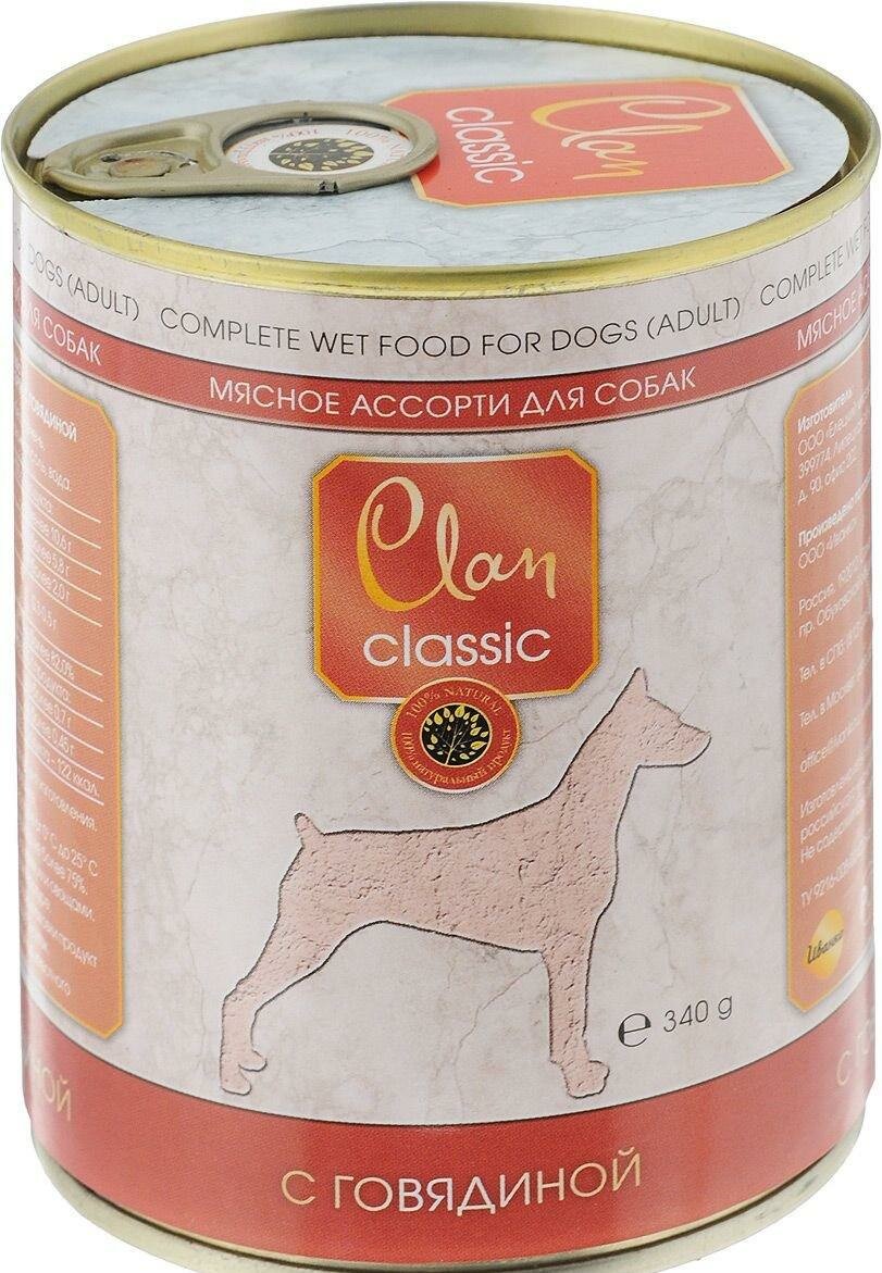 Корм полнорационный консервированный Clan CLASSIC для собак, Мясное ассорти с говядиной, 340г, 12 шт.