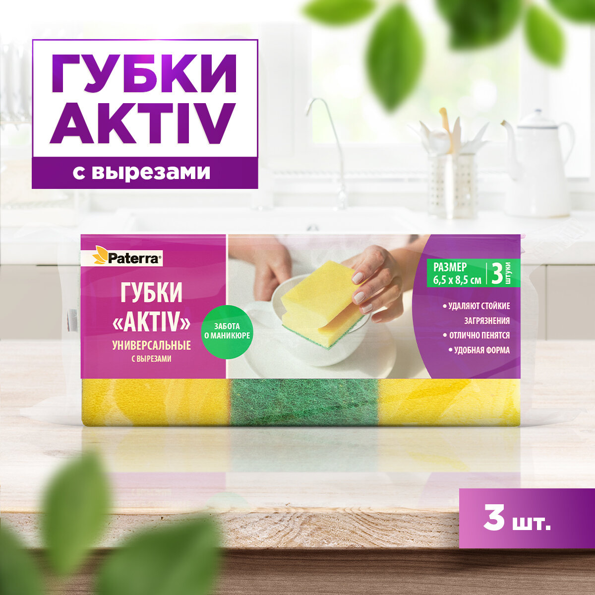Губки для посуды PATERRA Aktiv 3шт 65 85 44мм с вырезами