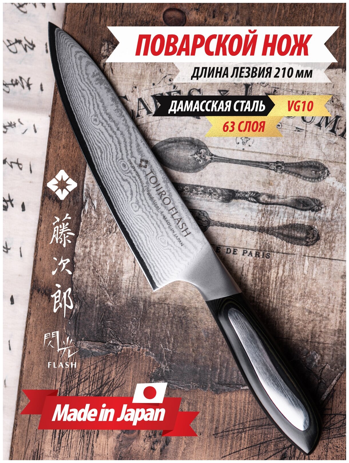 Отзывы на TOJIRO Нож кухонный поварской flash длина лезвия 210 мм, сталь vg10, 63 слоя, рукоять микарта FF-CH210