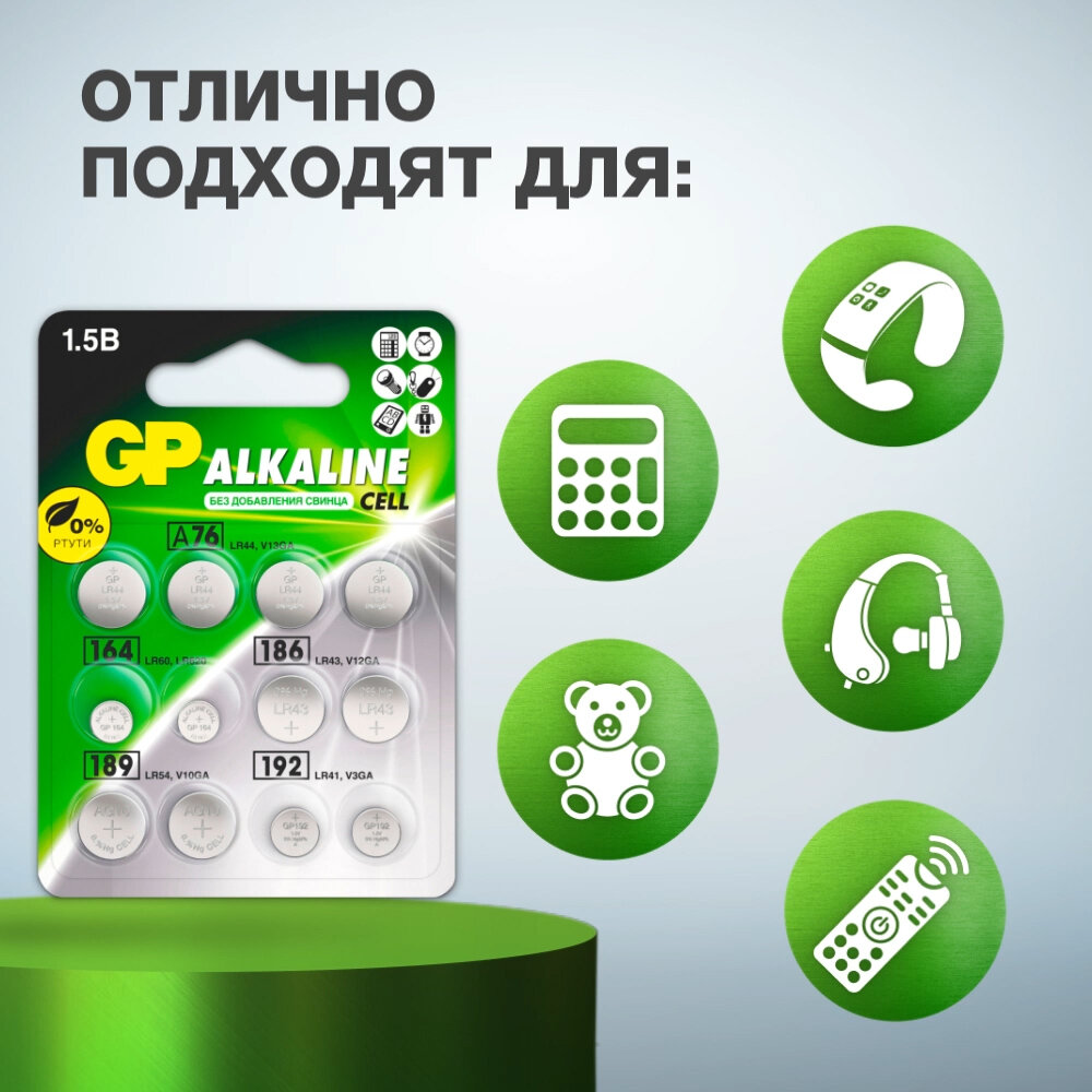 Батарейка GP Набор Alkaline Cell LR44, LR41, LR621, LR43, LR54, в упаковке: 12 шт. информация: