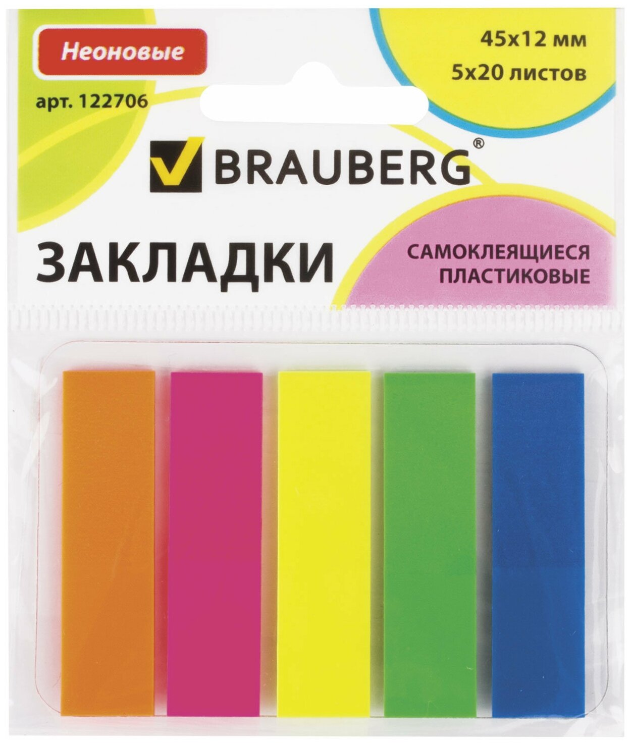 Закладки самоклеящиеся BRAUBERG неоновые, 45х12 мм, 5 цв. х 20 л., в пластиковой книжке, европодвес, 122706, 1 шт