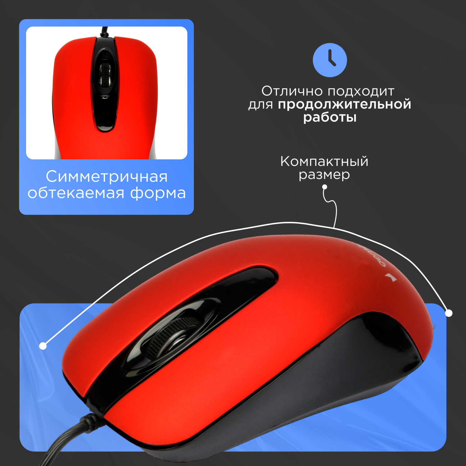 Мышь Gembird MOP-400-R, USB, красный, бесшумный клик, 2 кнопки+колесо кнопка, 1000 DPI, soft-touch, кабель 1.45м, блистер 922 ₽