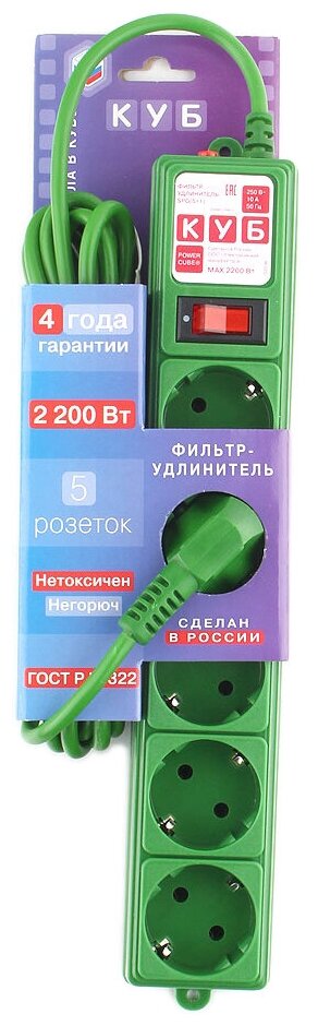 Фильтр-удлинитель Power Cube SPG-MXTR-13, 3 м, 5 розеток, зеленый, 10 А/2, 2 кВт