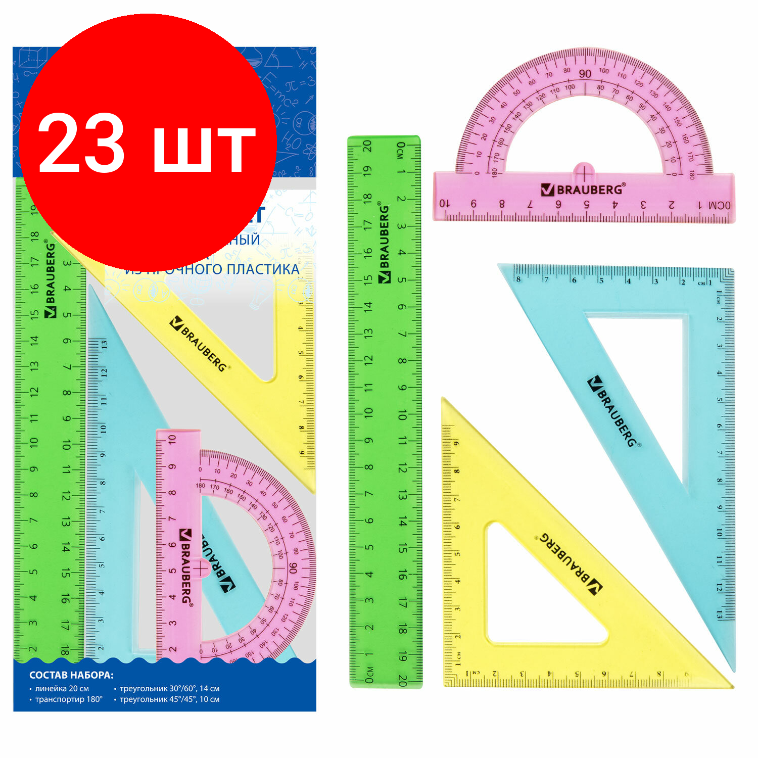 Комплект 23 шт, Набор чертежный средний BRAUBERG "Crystal" (линейка 20 см, 2 угольника, транспортир), цветной, 210296 информация: