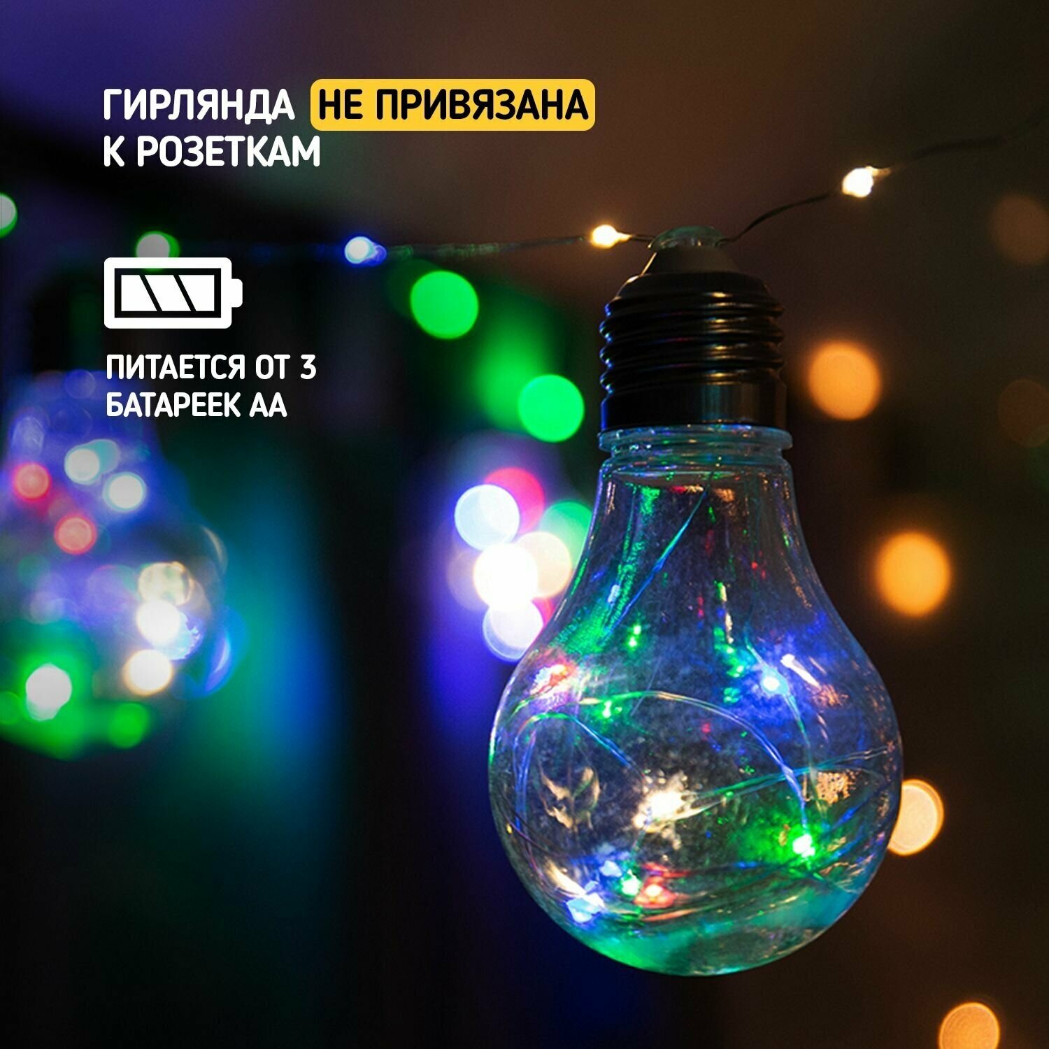 Светодиодная гирлянда NEON-NIGHT "Ретро-лампы" 3 м, 100 разноцветных светодиодов, прозрачный провод (питание от батареек)