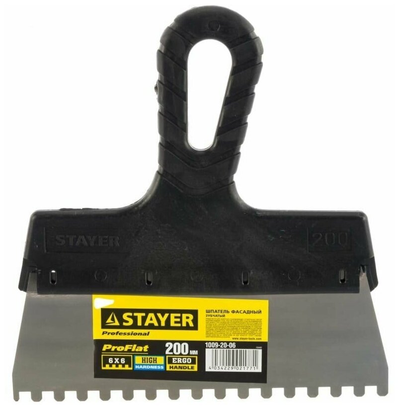 STAYER ProFLat 200 мм, зуб 6х6 мм, пластиковая ручка, зубчатый, нержавеющий, Фасадный шпатель, PROFESSIONAL (1009-20-06)