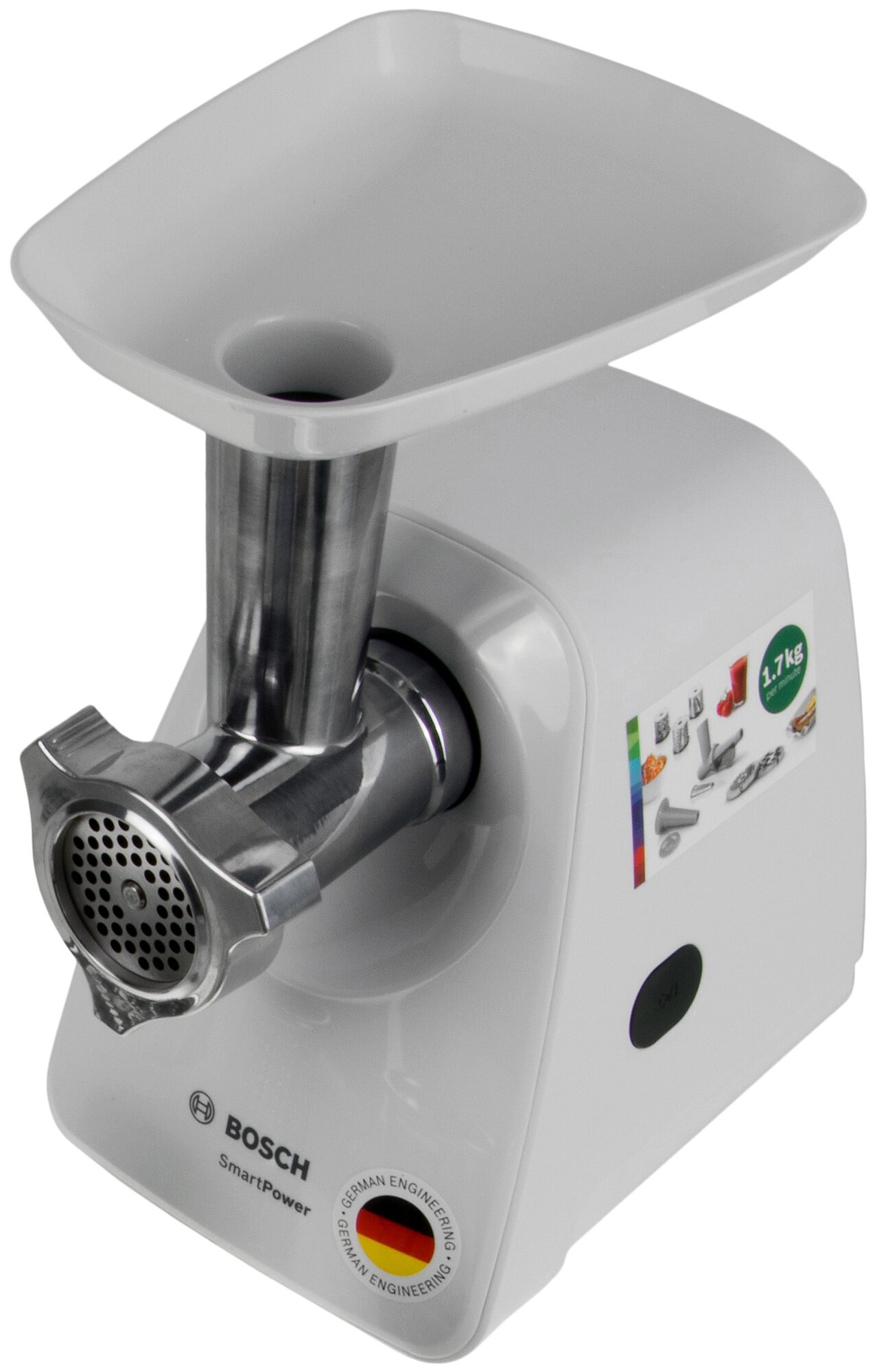 Мясорубка Bosch MFW2517W SmartPower, белая, с 4 насадками, мощность 350 Вт, производительность 1.7 кг/мин, максимальная мощность 1500 Вт