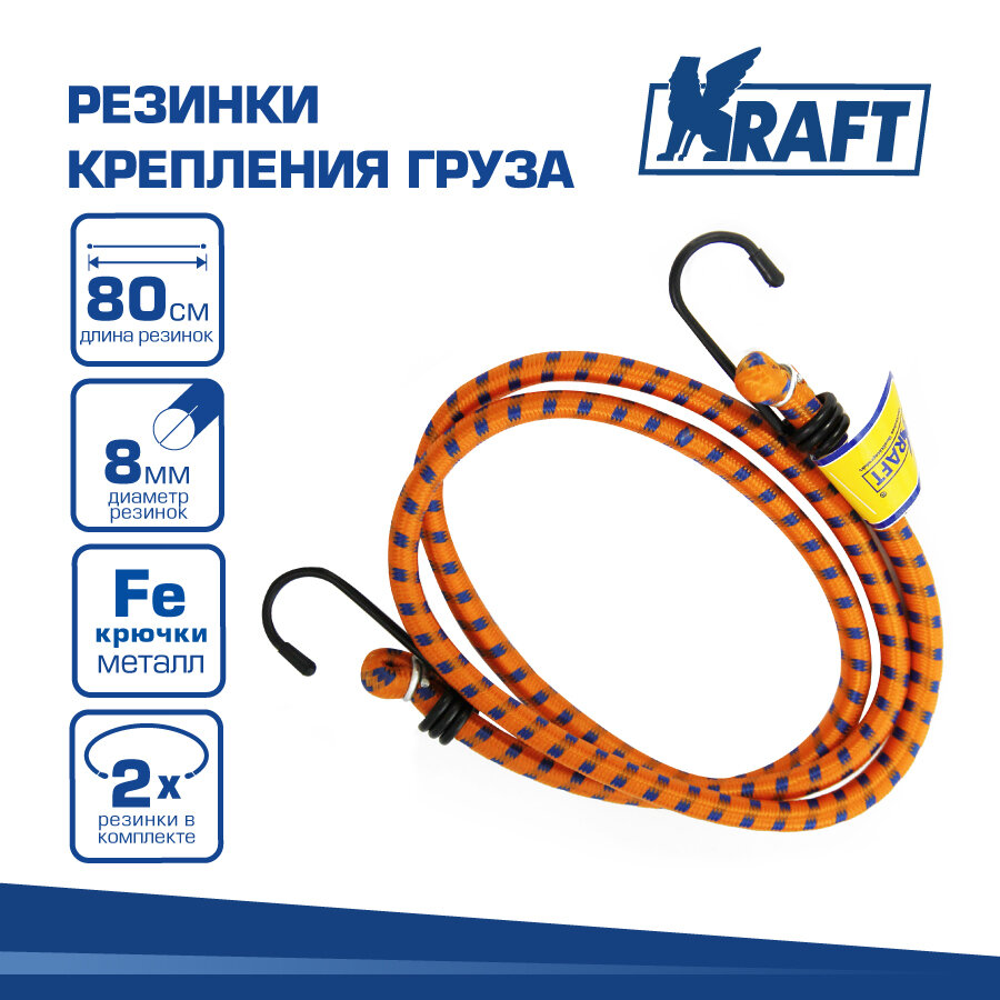 KRAFT KT860001 Набор резинок в багажник (80 см) "KRAFT" (D=8 мм, метал. крючки) (2 шт.)