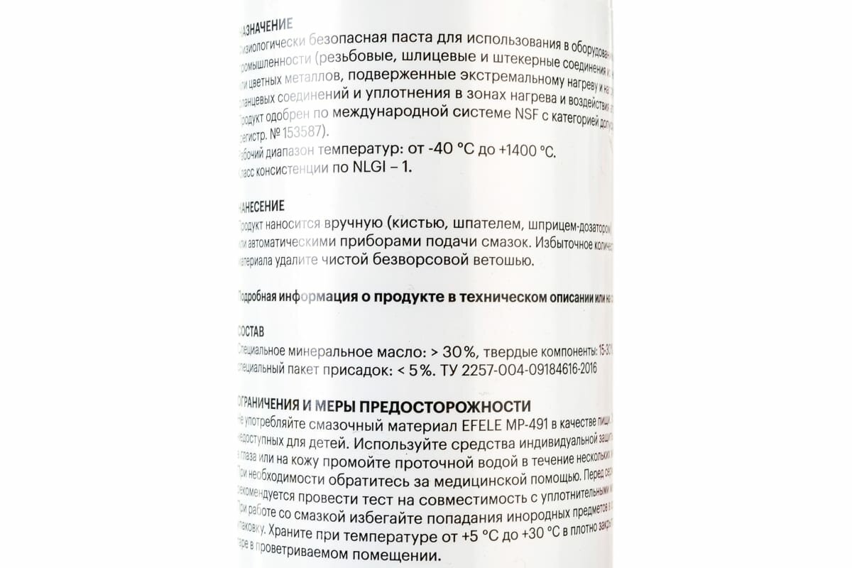 Отзывы на EFELE Противозадирная смазка MP-491 с пищевым допуском 400 г 0091099