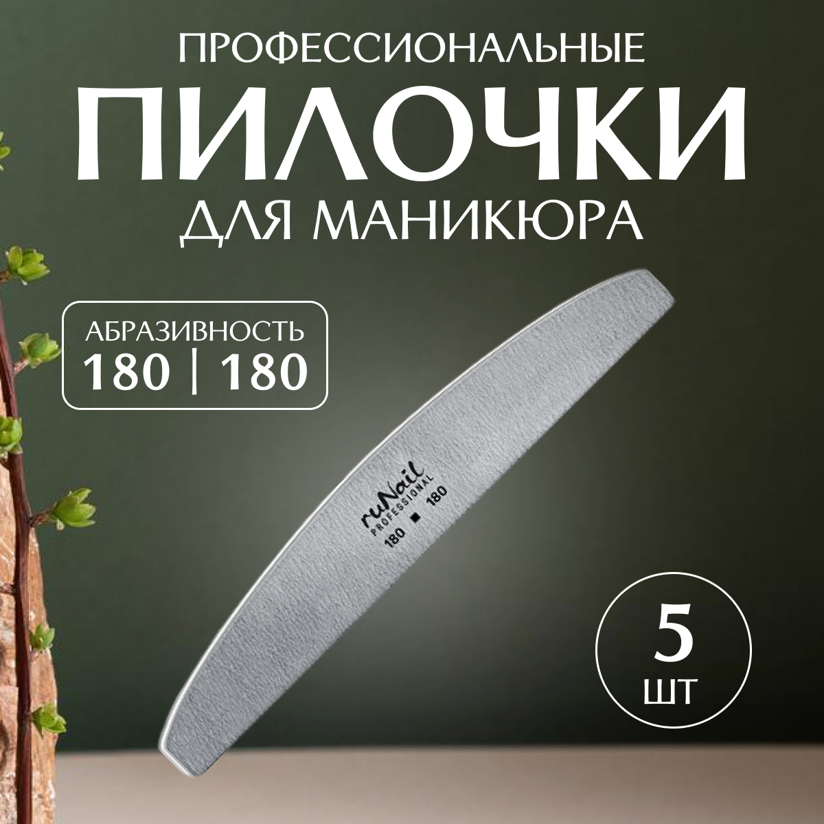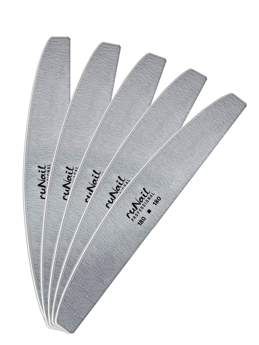 RuNail, набор пилок для ногтей полукруглые (серые, 180/180), 5 шт