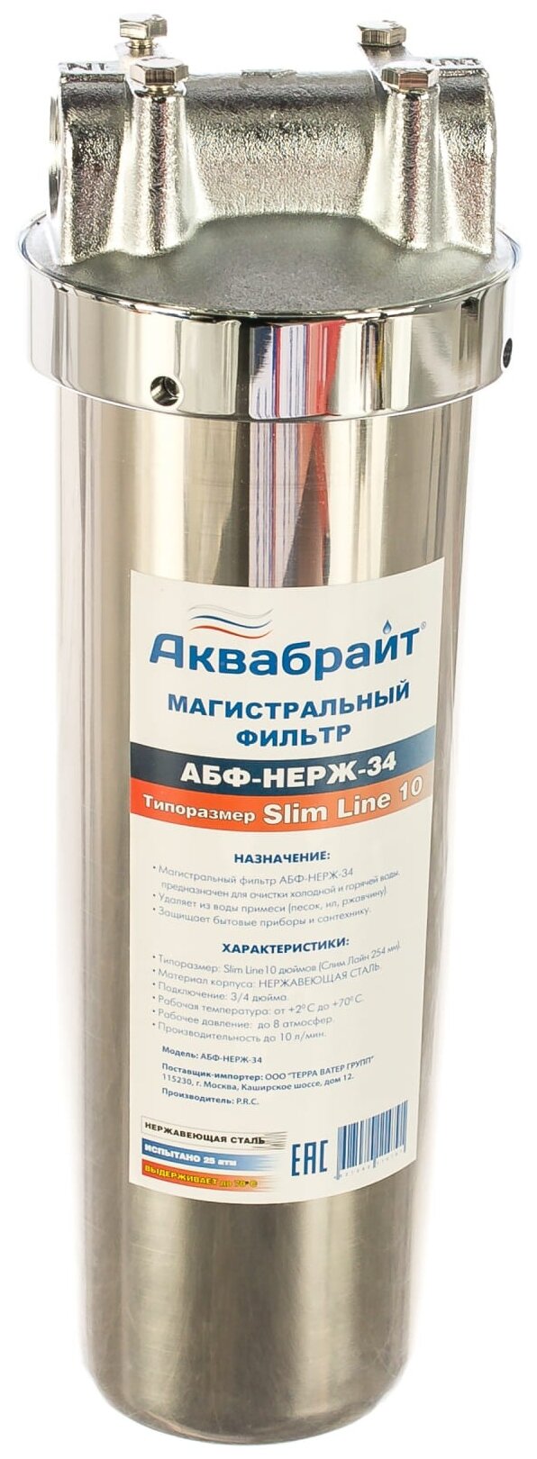 Магистральный фильтр из нержавеющей стали Аквабрайт АБФ-НЕРЖ-34 SlimLine информация: