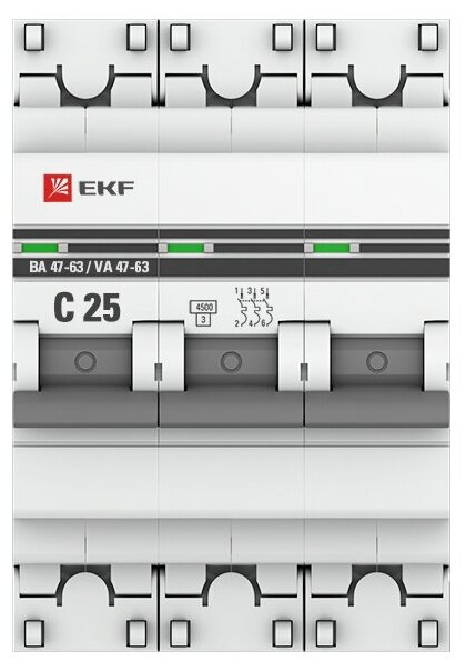 Автоматический выключатель EKF 3P 25А (C) 4,5kA ВА 47-63 EKF PROxima 3 штуки информация:
