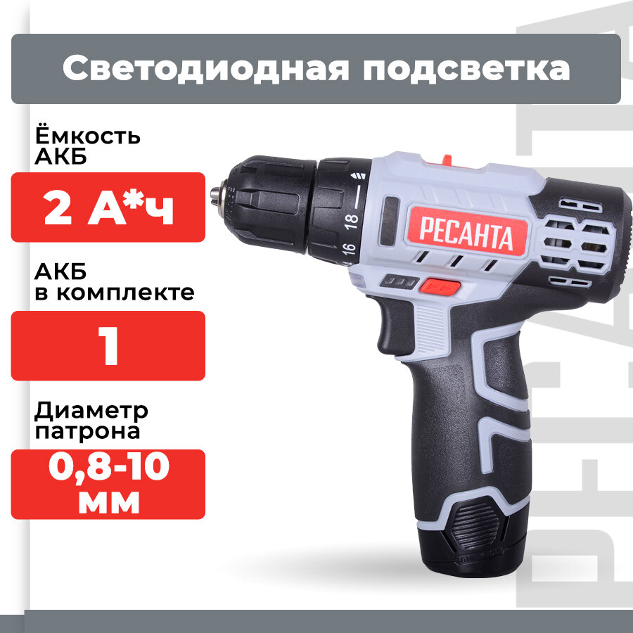10 цен на Дрель-шуруповерт аккумуляторная ДА-12-2ЛК Ресанта 75/14/2