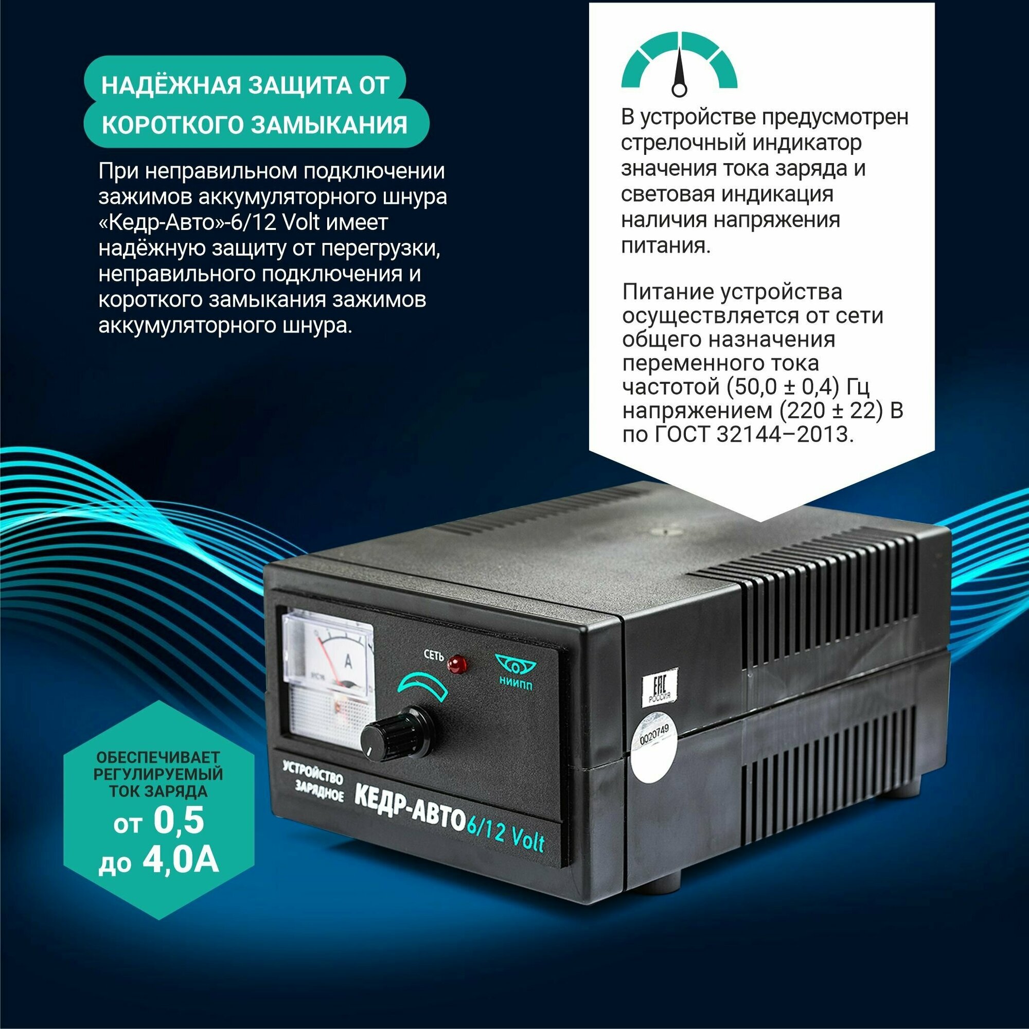10 цен на Зарядное устройство для аккумуляторов авто "Кедр-Авто 6/12 Volt" (ручная регул, 4А, 85Вт, 12В, индикатор стрелка)