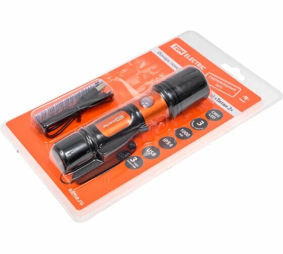 Отзывы на Фонарь Tdm Electric «Титан 2» 10 Вт 1 светодиод CREE 1000 лм, 1х18650 3.7 В 2200 мА*ч , IPX4, USB, SQ0350-0061