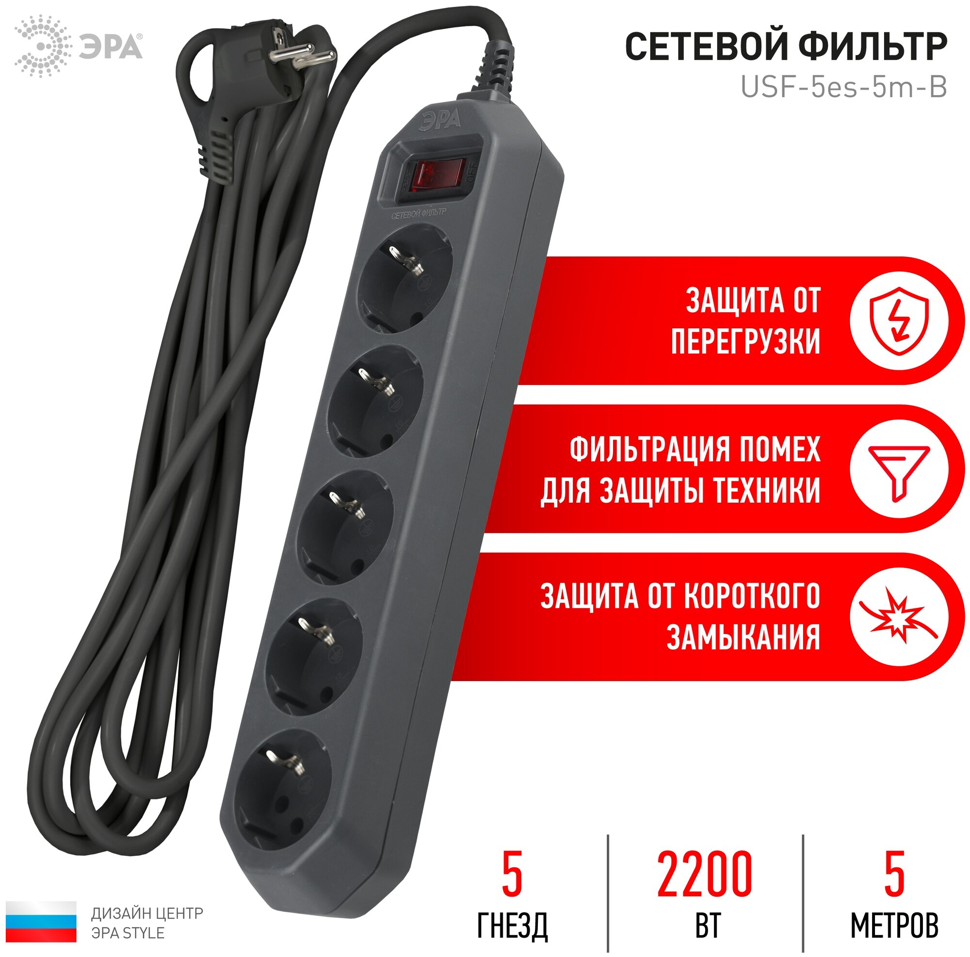 Сетевой фильтр Эра с базовой защитой, заземл. и выкл. 5 розеток 5м 10А, Чёрный, USF-5es-5m-B (Б0019737)